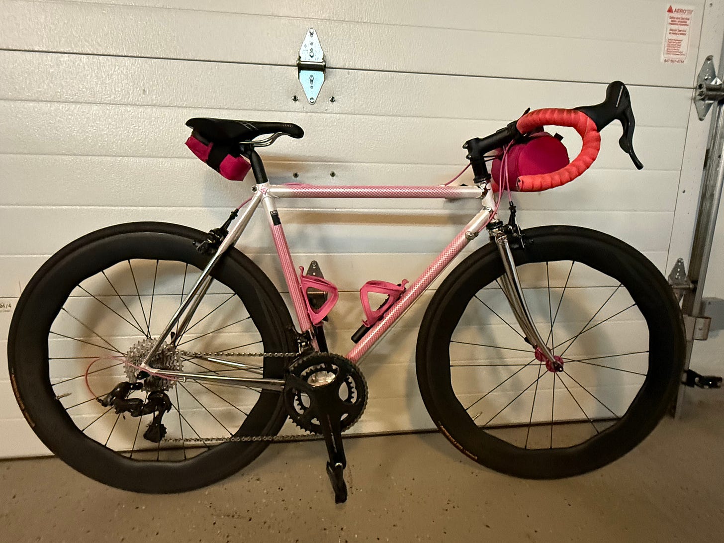 So this paragraph is a short commercial. If you’re looking for a good go-fast bike, you know what they cost, and you’re comfortable with the price, tell Greg at Red Rose Imports in Lancaster, PA, that Erin said to call, and you want a Tommasini. It’s an honored firm owned by women, and they do custom sizing and paint at no extra charge. PA doesn’t charge sales tax if the item is shipped out of state, so have the frame and whatever else shipped to your local bike shop, and have them add your seat, seat post, front stem, handlebars, and pedals, then get it ready to ride. You’ll get a better, prettier bike for probably less than the carbon fiber equivalent at a “Big Box” bike store. Only drawback? It takes 3-4 months between the time you order your bike and the time you get it. These frames are hand-built by skilled craftspeople in Italy, not on an assembly line in China. They are durable goods, not throwaway items.